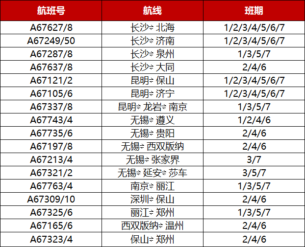 今年夏航季,湖南航空新开长沙⇌北海、昆明⇌保山、昆明⇌济宁、长沙⇌济南、长沙⇌泉州、无锡⇌遵义、丽江⇌郑州、南京⇌丽江、昆明⇌龙岩⇌南京、长沙⇌大同、无锡⇌贵阳、深圳⇌保山、无锡⇌西双版纳、无锡⇌延安⇌莎车、西双版纳⇌温州、保山⇌郑州、无锡⇌张家界。