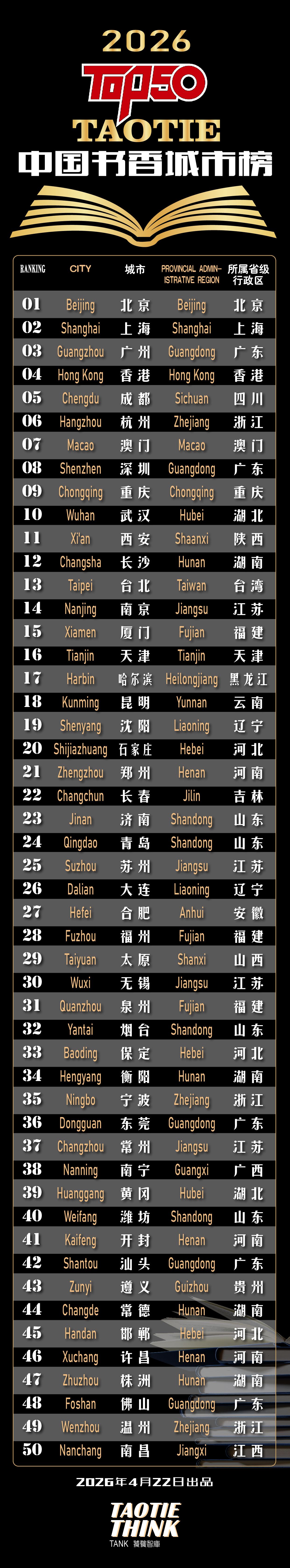 4 月 22 日,第 31 个世界读书日来临之际,扎根澳门的TAOTIE THINK TANK(饕餮智库)正式发布2026 TAOTIE 中国书香城市榜。湖南延续强劲书香实力,长沙、衡阳、常德、株洲四座城市成功上榜,排名均与 2025 年持平。