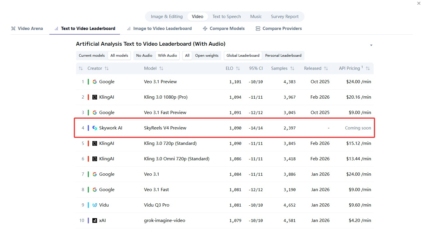 截止27日,SkyReels V4在AA榜单所有模型中排名位置。Artificial Analysis网站截图
