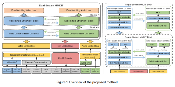 SkyReels-V4则采用的双流 MMDiT 架构,可以实现视频和音频两条线从任务开始就并肩工作,共享同一个大脑(文本理解模型)。且通过互相参考的双向跨注意力机制,提高生成视频中角色的嘴型、动作和声音的匹配度。