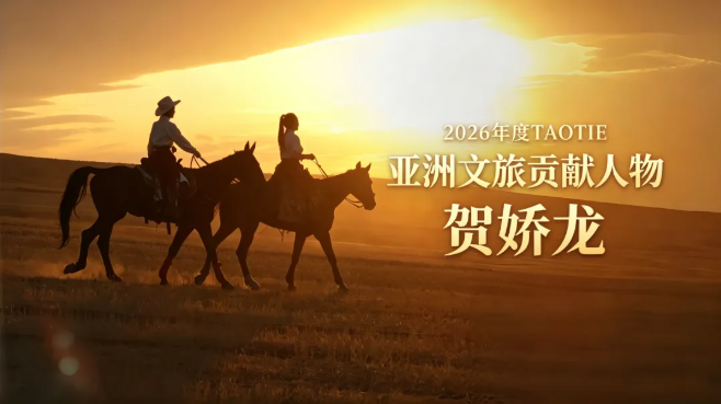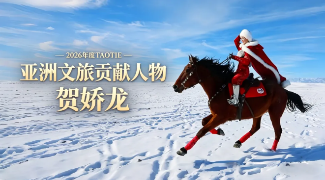 “今天,我们将颁授一项特别荣誉——2026年度TAOTIE亚洲文旅贡献人物,这一荣誉旨在致敬那些以非凡勇气和无私奉献,为文旅事业做出卓越贡献的先行者。此刻,我们要致敬的这位巾帼行者,她曾一身红裳策马雪原,用镜头将壮丽的边疆风光与深厚的民族文化带到了亿万观众面前,并将流量转化为助农力量,温暖了万千家庭。她就是贺娇龙。”