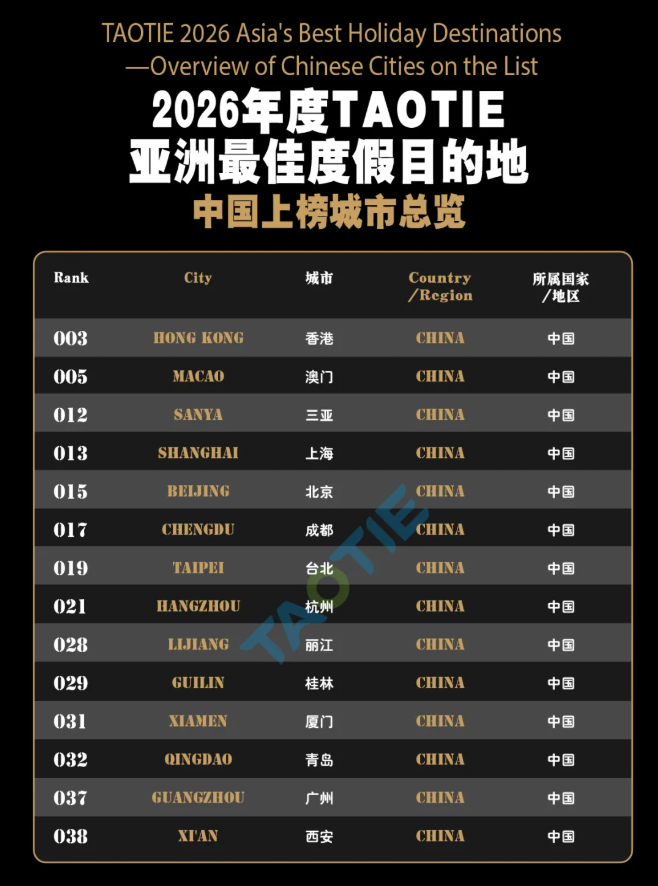 2026年4月11日,在第二届AT Asia亚洲文旅大赏上,TAOTIE Think Tank(饕餮智库)正式发布了2026年度《TAOTIE亚洲最佳度假目的地TOP50》榜单。